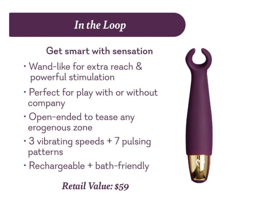 In the Loop is wand-like for extra reach & powerful stimulation. Perfect for play with to without company. Open-ended to tease any erogenous zone. 3 vibrating speeds & 7 pulsing patterns. Rechargeable and bath-friendly.